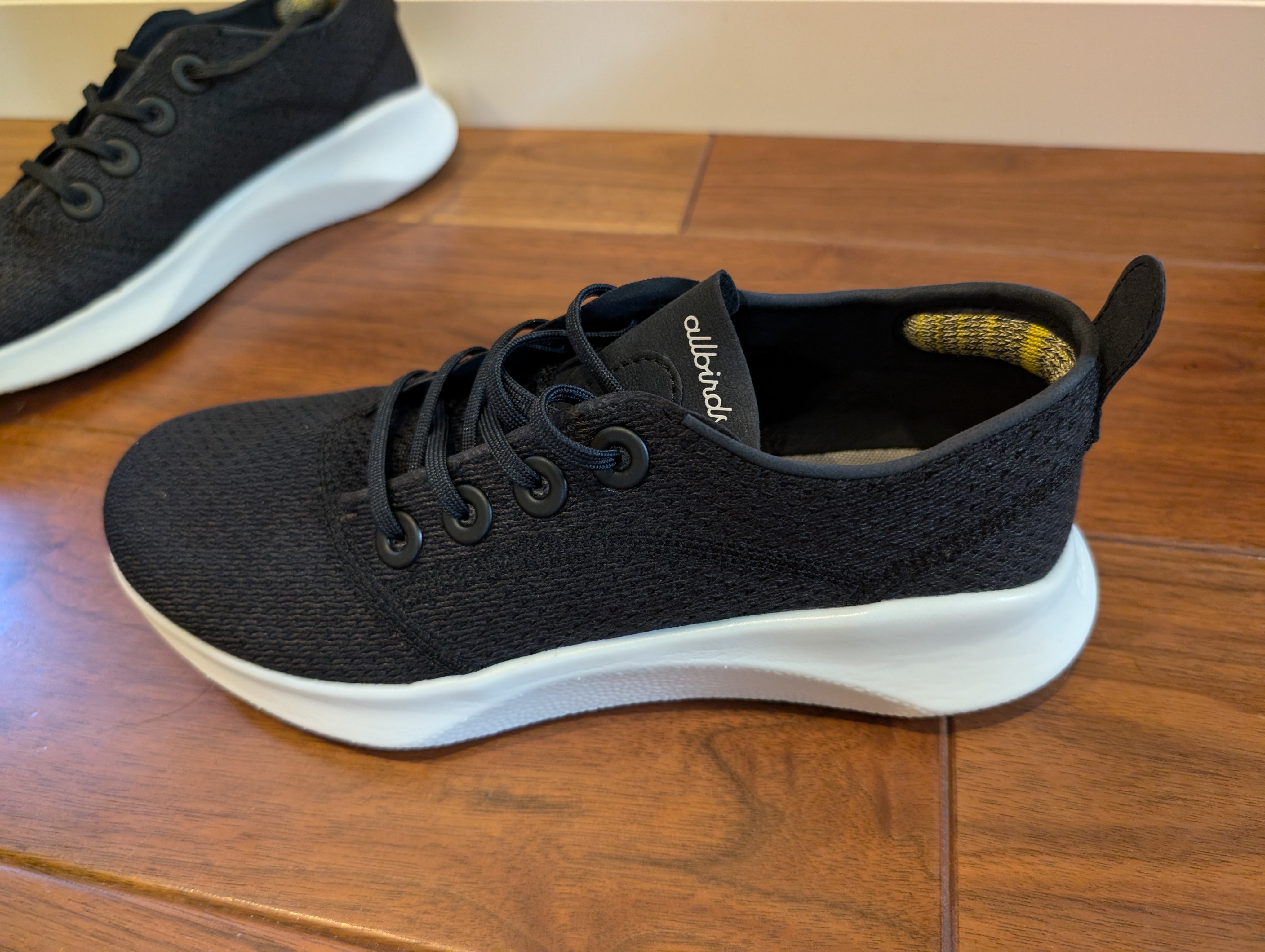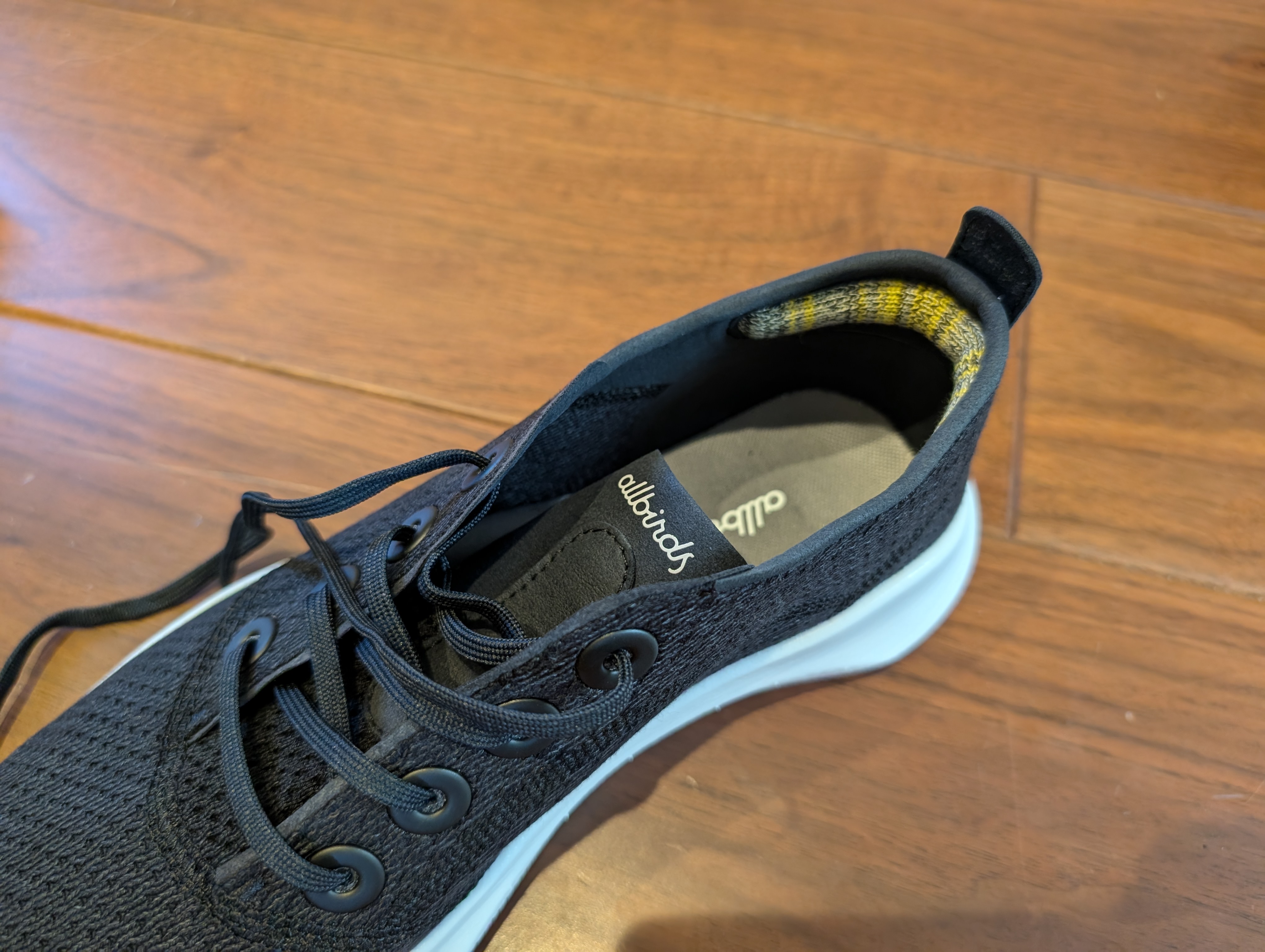 軽さが際立つスーパーライト ツリーランナーですが、軽量化のためかシュータン(足の甲に当たる部分)が非常に薄く設計されています。このため、履く際にシュータンが内側に入り込んでしまうことがあり、指でつまんで押さえながら履く必要があります。些細なことではありますが、履きやすさという点でやや気になるポイントです。もう少しシュータンに厚みがあれば、さらに履きやすくなるかもしれません。
